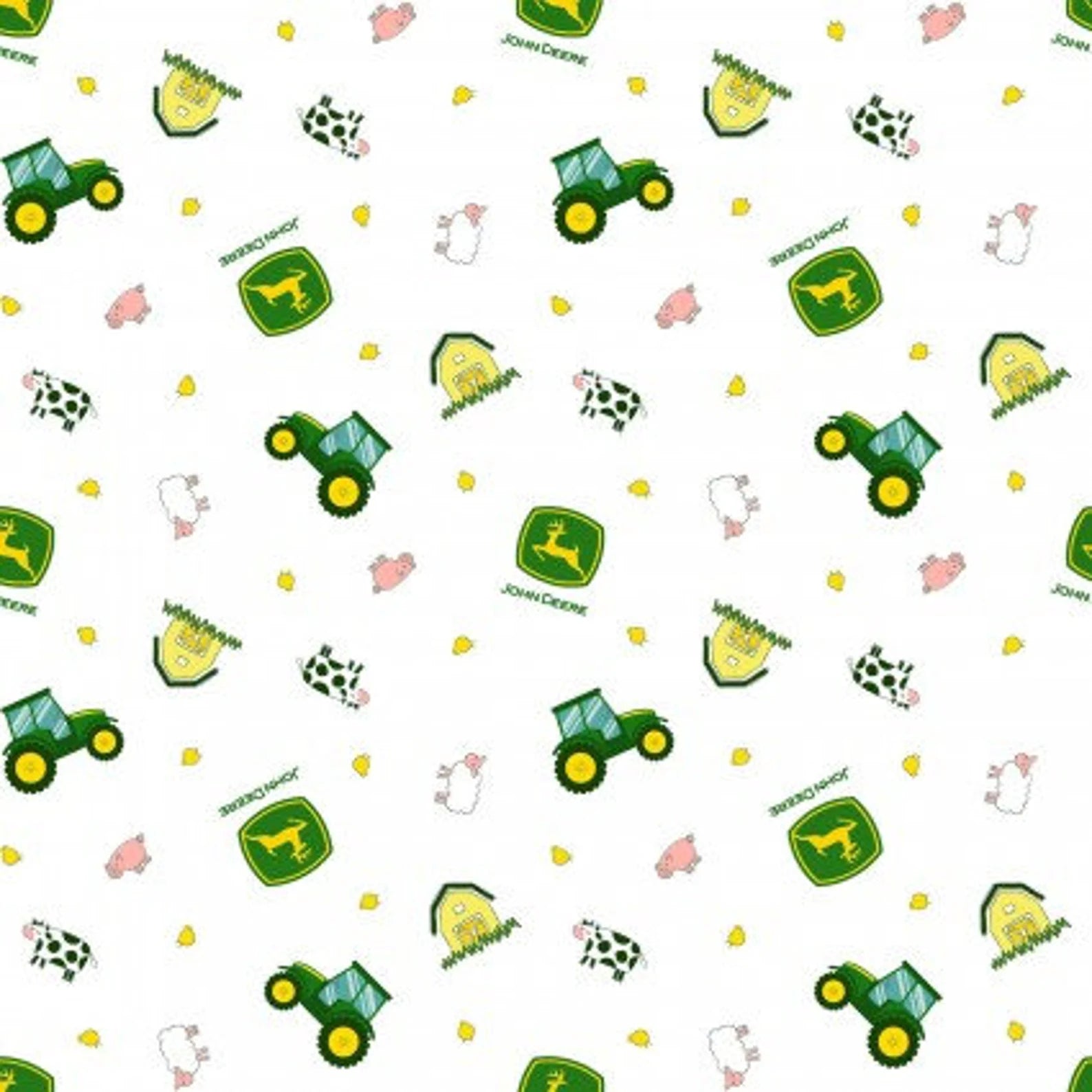 John Deere Tractor Animal Toss fabric by Springs Creative features the iconic green and yellow brand on 44-inch wide, 100% cotton quilting material. Perfect for quilting projects, crafts, apparel, and home décor. Machine wash warm and tumble dry low.