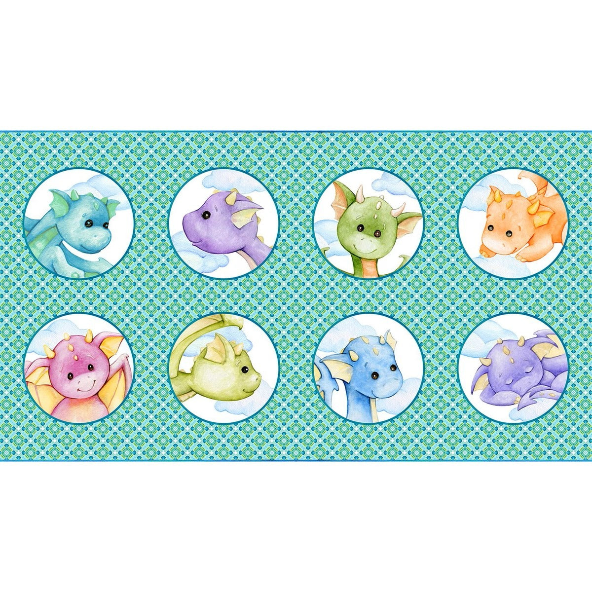 Dragon Friends by Jason Yenter for In The Beginning Fabrics brings a world of whimsy and imagination to life with its playful, dragon-filled designs. This fabric is digitally printed, giving it brighter, more vibrant colors than traditional screen-printed fabrics. Create a unique look in your projects with this panel featuring circular frames with playful baby dragons peeking through, all on a geometric teal background. Panel measures approximately 23" x 44".